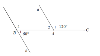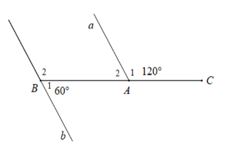 Nhận thấy \(\widehat {{A_2}} = \widehat {{B_2}} = 120^\circ \) mà hai góc ở vị trí đồng vị nên \(a//b.\)