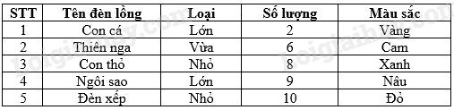 Thống kê về các loại đèn mà các bạn học sinh lớp 8B làm được để tặng cho các trẻ em nghèo nhân dịp Tết Trung thu được cho trong bảng dữ liệu sau: