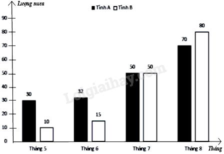 Lượng mưa trung bình của 4 tháng ở hai tỉnh A và B (đơn vị: mm) được người lập thể hiện qua biểu đồ cột kép ở hình bên dưới. Biết tổng lượng mưa trung bình của hai tỉnh với mỗi tháng không quá 100mm.