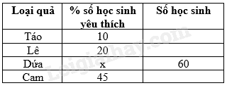 Bảng thống kê số phần trăm học sinh và số lượng học sinh yêu thích các loại quả (mỗi học sinh chỉ chọn một loại quả) của khối 9 một trường như sau: