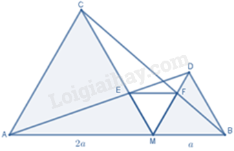 Cho điểm \(M\) thuộc đoạn thẳng \(AB\) sao cho \(MA = 2MB\) . Vẽ về một phía của \(AB\) các tam giác đều \(AMC\) và \(MBD\) . Gọi \(E\) là giao điểm của \(AD\) và \(MC\) , \(F\) là giao điểm của \(BC\) và \(DM\) . Đặt \(MB = a\) . Tính \(ME,MF\) theo \(a\) .