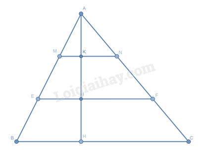 \( \) nên \( {S_{MNEF}} = \frac{{\left( {MN + FE} \right)KI}}{2} = \frac{{\left( {\frac{1}{3}BC + \frac{2}{3}BC} \right) \cdot \frac{1}{3}AH}}{2} = \frac{1}{3}{S_{ABC}} = 30\,{\rm{c}}{{\rm{m}}^2}\)