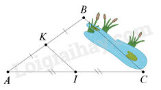 Xét \(\Delta ABC\) có: \(K\) là trung điểm của \(AB\) , \(I\) là trung điểm của \(AC\) nên \(\frac{{AK}}{{AB}} = \frac{{AI}}{{AC}} = \frac{1}{2}\) suy ra \(KI // BC\) (định lí Thalès đảo)