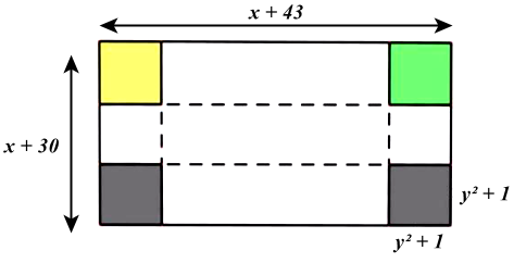 Một tấm bìa cứng hình chữ nhật có chiều dài là x + 43 (cm), chiều rộng x+30 (cm). Người ta cắt ở mỗi góc của tấm bìa hình vuông cạnh \({y^2} + 1\) và xếp phần còn lại thành một cái hộp không nắp.