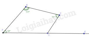 Vì góc ngoài đỉnh D bằng \({50^o}\) nên góc trong tại đỉnh D là: \(\widehat D = {180^o} - {50^o} = {130^o}\)