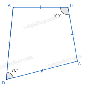 Tứ giác ABCD có AB = BC; CD = DA , \(\widehat B = {100^o};\widehat D = {70^o}\) . Tính \(\widehat A{,^{}}\widehat C\) ?