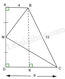 \(B{C^2} = C{K^2} + K{B^2}\) hay \({13^2} = {5^2} + K{B^2} \Rightarrow KB = 12(cm)\) nên \( \Rightarrow AD = KB = 12(cm)\)