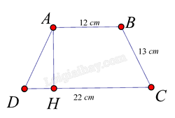 \(C{{D}} = AB + 2.DH \Rightarrow DH = \frac{{C{{D}} - AB}}{2} \Rightarrow DH = \frac{{22 - 12}}{2} = 5cm\)