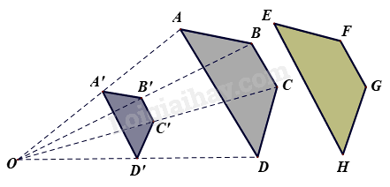 Vì B, C, A, D lần lượt là trung điểm của OF, OG, OE, OH nên \(\frac{{OB}}{{FO}} = \frac{{OA}}{{OE}} = \frac{{OD}}{{OH}} = \frac{{OC}}{{OG}} = \frac{1}{2}\) và các đường thẳng AD, EH, GC, FB cùng đi qua điểm O nên hình ABCD là hình đồng dạng phối cảnh với hình EFGH tâm O tỉ số \(\frac{1}{2}\).