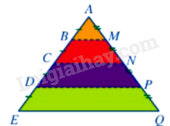 Vì đoạn thẳng MN là hình đồng dạng phối cảnh của đoạn thẳng BC tâm A, tỉ số đồng dạng \(\frac{1}{4}\) nên \(\frac{{AM}}{{AB}} = \frac{{AN}}{{AC}} = \frac{1}{4} \Rightarrow AB = 4AM,AC = 4AN\)