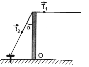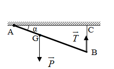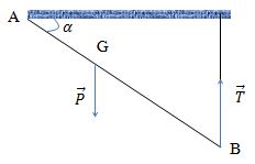 \(\begin{array}{l} \leftrightarrow T.AB.\cos \alpha = m.g.\dfrac{{AB}}{2}\\ \leftrightarrow T = \dfrac{{\dfrac{{mg}}{2}}}{{\cos \alpha }} = \dfrac{{\dfrac{{1.10}}{2}}}{{\dfrac{{\sqrt 3 }}{2}}} = \dfrac{{10}}{{\sqrt 3 }}\,N\end{array}\)