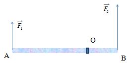 Một cái thước AB = 1m đặt trên mặt bàn nhẵn nằm ngang, có trục qua O cách đầu A một khoảng 80cm. Một lực \({F_1} = 4N\) tác dụng lên đầu A theo phương vuông góc với thước và lực thứ hai \({F_2}\) tác dụng lên đầu B của thước và theo phương vuông góc với thước. Các lực đều nằm trên mặt phẳng nằm ngang. Nếu thước không chuyển động thì lực \({F_2}\) có hướng và độ lớn: