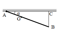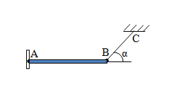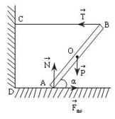Một thanh AB dài 2m khối lượng m = 2kg được giữ nghiêng một góc \(\alpha \) trên mặt sàn nằm ngang bằng một sợi dây nằm ngang BC dài 2m nối đầu B của thanh với một bức tường đứng thẳng; đầu A của thanh tựa lên mặt sàn. Hệ số ma sát giữa thanh và mặt sàn bằng \(\frac{{\sqrt 3 }}{2}\). Các giá trị của \(\alpha \) để thanh có thể cân bằng.