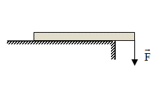 Thanh kim loại có chiều dài \(l\), khối lượng m đặt trên bàn nhô ra một đoạn bằng \(\frac{1}{4}\)chiều dài thanh. Tác dụng lực có độ lớn 40N hướng xuống thì đầu kia của thanh kim loại bắt đầu nhô lên, lấy \(g = 10m/{s^2}\). Khối lượng của thanh kim loại là: