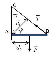 \(P.{d_1} = T.{d_2} < = > mg{d_1} = T{d_2} < = > mg\frac{{AB}}{2} = T.AB\sin \alpha < = > 20.10.0,5 = T\sin 60 < = > T = \frac{{200}}{{\sqrt 3 }}\,N\)