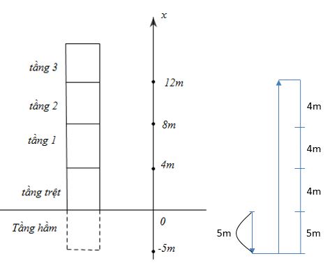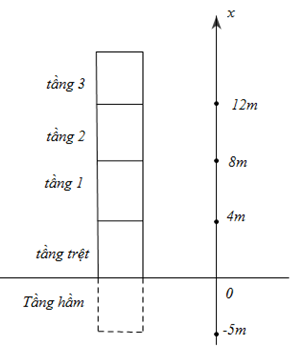 Một thang máy mang một người từ tầng trệt đi xuống tầng hầm sâu 5m, rồi lên đến tầng 3 . Biết rằng mỗi tầng cách nhau 4m. Trục toạ độ có gốc và chiều dương như hình vẽ.