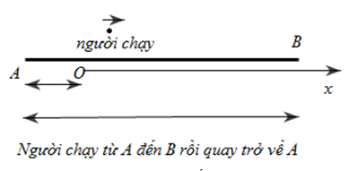 Một người chạy bộ theo đường thẳng AB = 50m, từ A đến B rồi quay về A. Gốc toạ độ O ở trong khoảng AB, cách A một khoảng 10m, chiều dường từ A đến B.