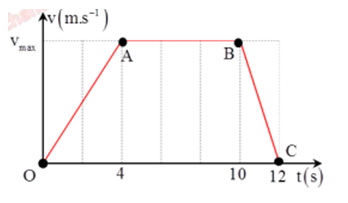 + Tốc độ trung bình của vật : \({v_{tb}} = \dfrac{s}{t} = \dfrac{{\dfrac{1}{2}{v_{{\rm{max}}}}.4 + {v_{{\rm{max}}}}.6 + \dfrac{1}{2}{v_{{\rm{max}}}}.2}}{{12}} = 9 \to {v_{{\rm{max}}}} = 12m/s\)