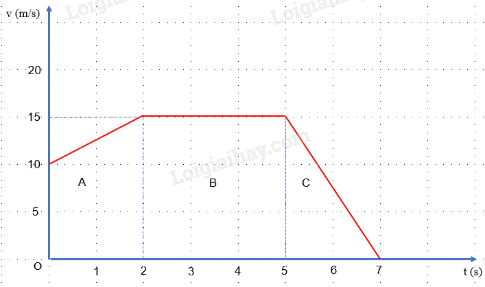 + Trên đoạn \(A \to B\) xe chuyển động chậm dần đều với gia tốc: \({a_1} = \frac{{{v_B} - {v_A}}}{{\Delta t}} = \frac{{10 - 20}}{{20}} = - 0,5m/{s^2}\)