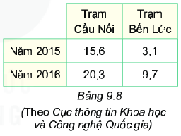 Bảng 9.8 cho biết độ mặn (đơn vị gam/lít) tại một số trạm quan trắc trên sông Vàm Cỏ vào tháng 3 trong hai năm 2015 và 2016. Để việc so sánh số liệu trong hai năm 2015 và 2016 trực quan hơn, Vuông đã vẽ biểu đồ cột kép như hình 9.22a, Tròn lại vẽ biểu đồ như hình 9.22b.