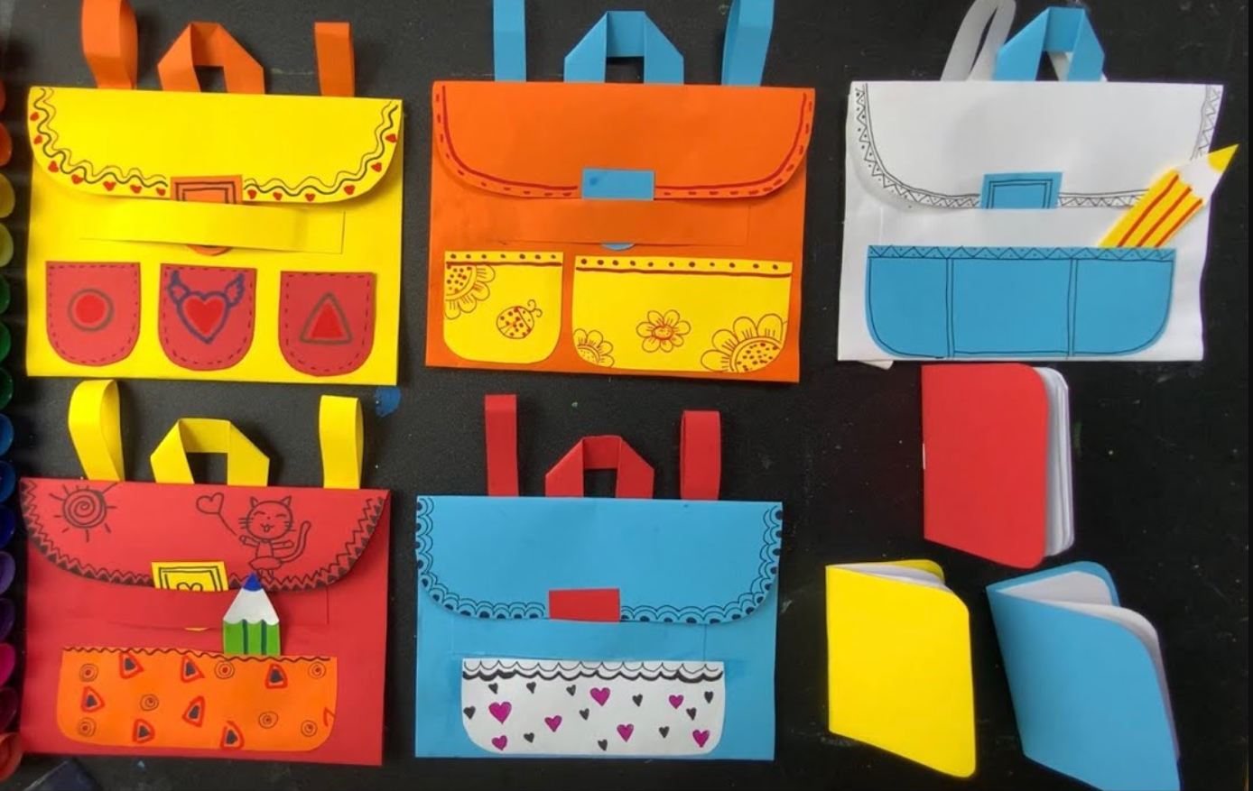 Cắt dán tạo hình cặp sách và trưng bày tạo cửa hàng
