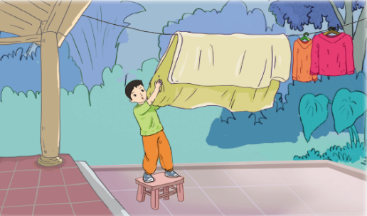 d) Bạn bắc ghế để lấy chăn dạ và áo len từ dây phơi xuống.