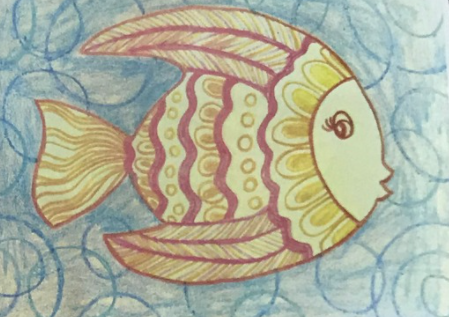 Bức tranh vẽ 1 chú cá rất điệu đà, bao gồm nhiều họa tiết ở vảy, thân, đuôi cá/ Màu sắc: gam trầm, nhìn rất hoài cổ