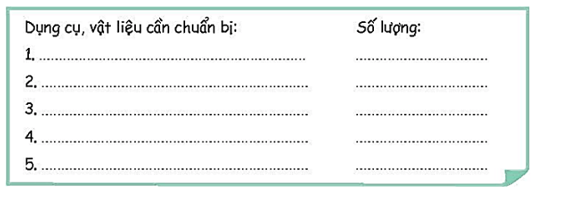 - Liệt kê những dụng cụ nhóm em cần chuẩn bị để thực hiện nhiệm vụ: