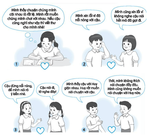 Viết các số từ 1 đến 4 vào ô trống dưới tranh để sắp xếp thứ tự các bước hòa giải bất đồng với bạn bè.