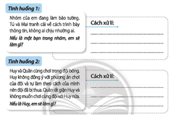 - Tình huống 2: Cách xử lí: Nếu là Huy, em sẽ nói chuyện riêng với Quân, xin lỗi Quân và các bạn trong đội vì sai lầm của mình mà đội thua, hứa sẽ rút kinh nghiệm, lần sau sẽ thực hiện theo chiến thuật của toàn đội.