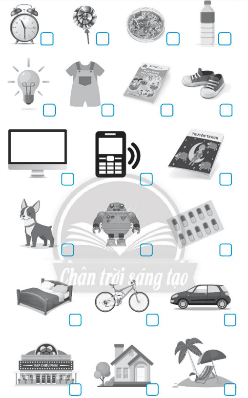 1. Đánh dấu X vào ô trống cạnh những thứ là nhu cầu của em.