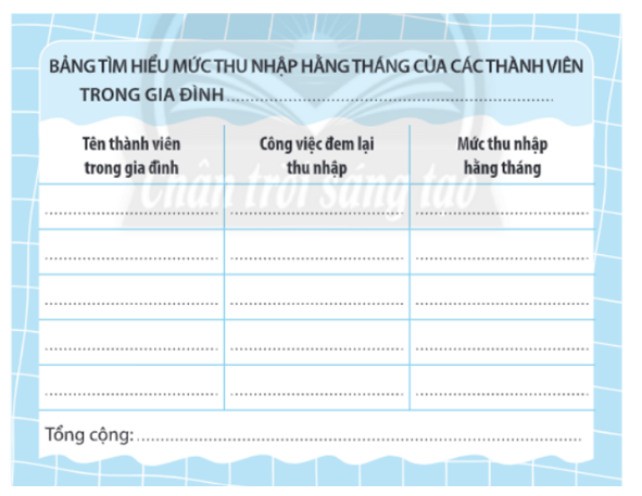 Chia sẻ kết quả tìm hiểu mức thu nhập hàng tháng của các thành viên trong gia đình em bằng cách hoàn thiện bảng sau: