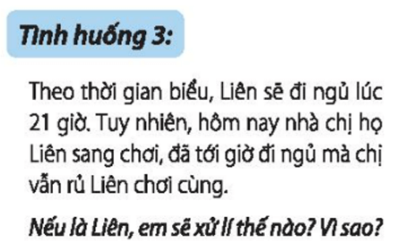 → Cách xử lí: Nếu là Liên, em sẽ nói với chị rằng đến giờ em đi ngủ rồi, hẹn chị ngày mai mình đi chơi với nhau.