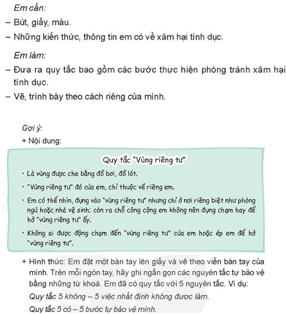 - Em đã lựa chọn quy tắc nào để trình bày trong sản phẩm thể hiện cách phòng tránh bị xâm hại tình dục?