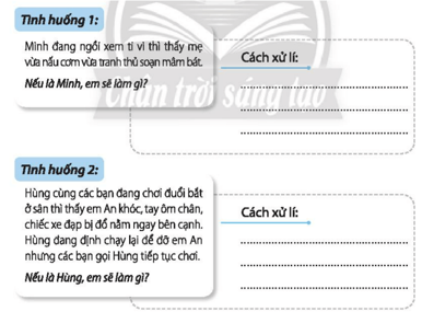 - Tình huống 1: Cách xử lí: Nếu là Minh, em sẽ tắt ti vi, vào giúp mẹ soạn mâm bát.