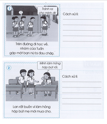 - Ở tình huống bức tranh số 2, em sẽ an ủi bạn Lan. Xem có thể sửa giúp bạn được hộp bút không. Có thể xin lỗi mẹ, tiếp tục dùng hộp bút cũ để thay thế và tiết kiệm.