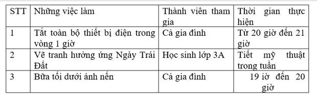 1. Em hãy lập kế hoạch thực hiện những việc làm để hưởng ứng Ngày Trái Đất bằng cách điền vào bảng sau: