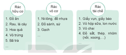 Đọc danh sách các loại rác dưới đây để vẽ, viết lên những tờ giấy hoặc bìa, sau đó dán lên thùng rác cho dễ nhớ.