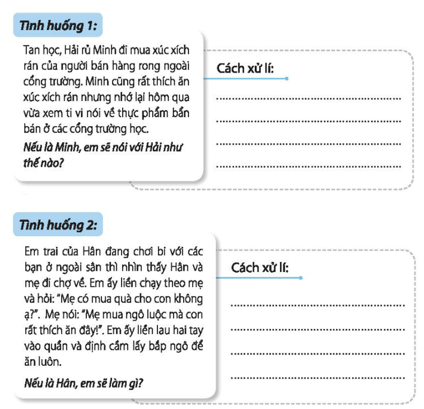 - Tình huống 1: Cách xử lí: Nếu là Minh, em sẽ nói với Hải không nên ăn xúc xích rán ngoài cổng trường và kể cho Hải nghe về bản tin nói về thực phẩm bẩn bán ở cổng trường hôm qua mình xem được.