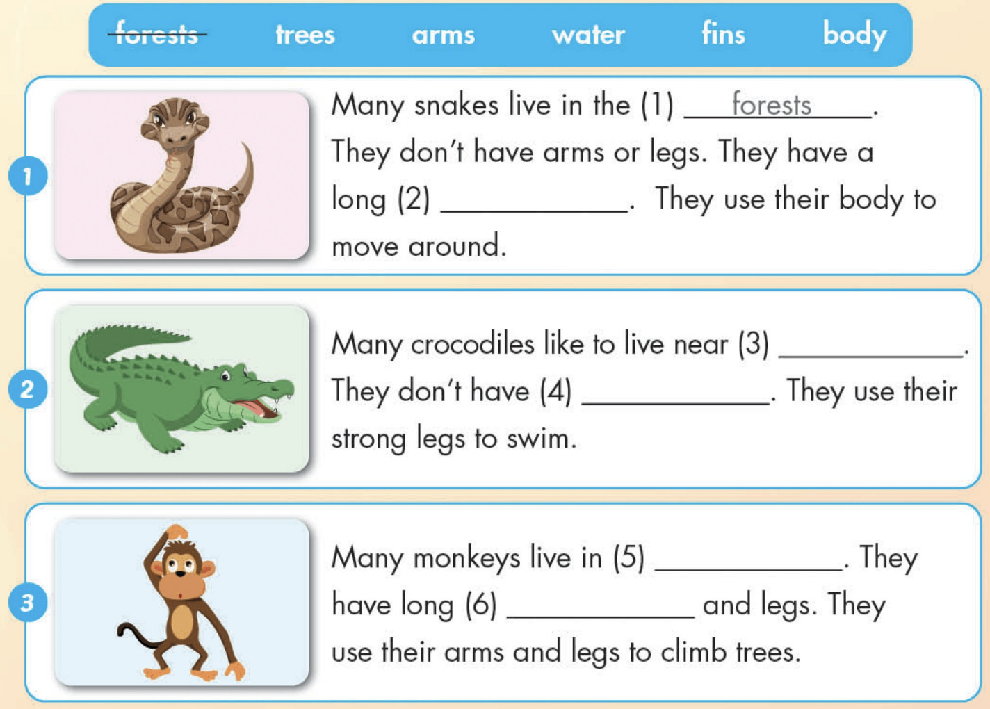 Many crocodiles like to live near water. They don't have fins. They use their strong legs to swim.