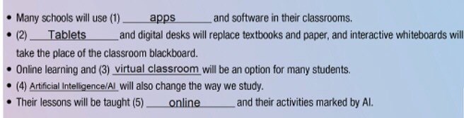 1. apps 2. Tablets 3. virtual classroom 4. Artificial Intelligence / AI 5. online