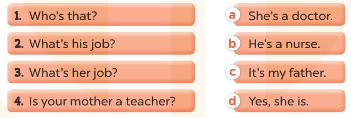 1. A: What’s her job? (Công việc của cô ấy là gì?)