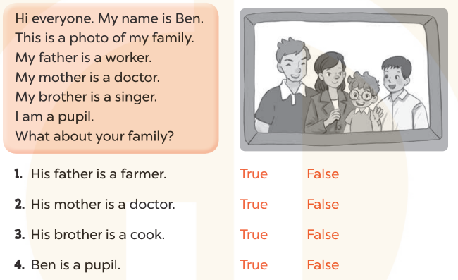 Chào mọi người. Tên của mình là Ben. Đây là tấm ảnh giai đình của mình. Bố của mình là một công nhân. Mẹ của mình là một bác sĩ. Anh trai của mình là ca sĩ. Mình là một học sinh. Còn gia đình bạn thì sao?
