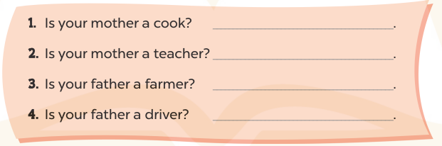 1. Is your mother a cook? (Mẹ của bạn là một đầu bếp phải không?)