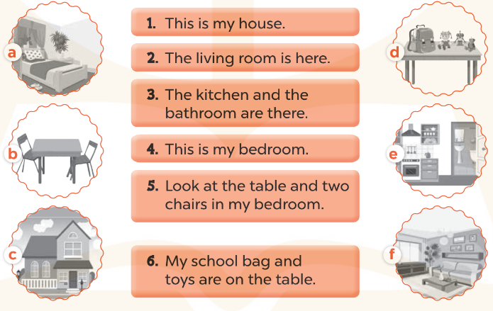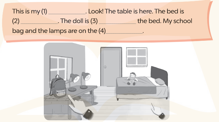 (Đây là phòng ngủ của tôi. Nhìn này! Chiếc bàn ở đó. Chiếc giường ở đó. Con búp bê thì ở trên giường. Chiếc cặp sách và những chiếc đèn ở trên bàn.)