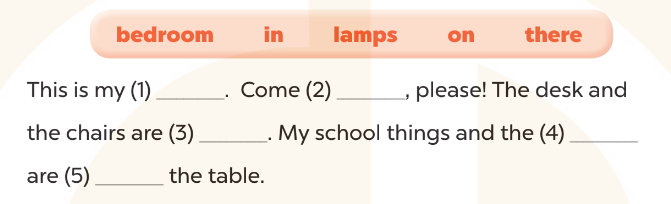 This is my bedroom. Come in, please! The desk and the chairs are there. My school things and the lamps are on the table.