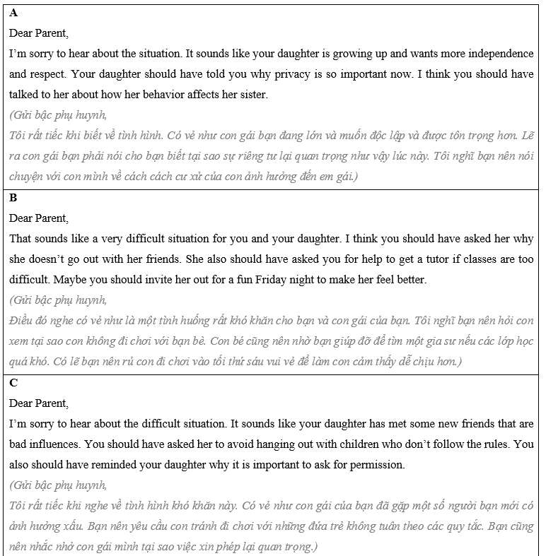 (Những người dưới đây đang tìm kiếm lời khuyên. Có bốn lời khuyên khác nhau. Quyết định xem lời khuyên nào sẽ phù hợp nhất cho những người dưới đây.)