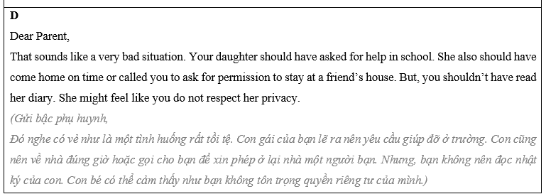 Mẹ: Nếu con muốn chúng ta tôn trọng con thì con phải có trách nhiệm hơn. Kiểm tra điện thoại của con và gọi cho chúng ta nếu con muốn về muộn.