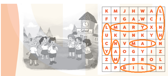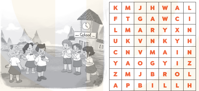 Complete and say. Find and circle six names. Look, complete and read. Read and match. Make sentences. Ask and answer. Read and complete. Look and write. Draw and write about your friend.