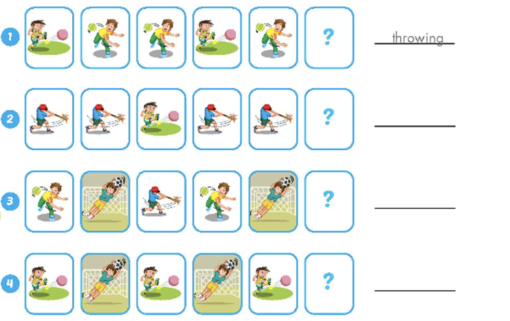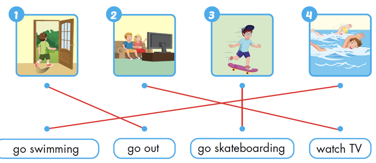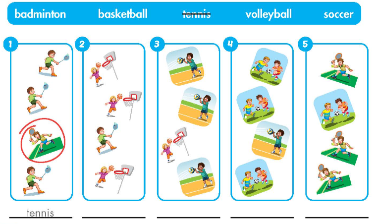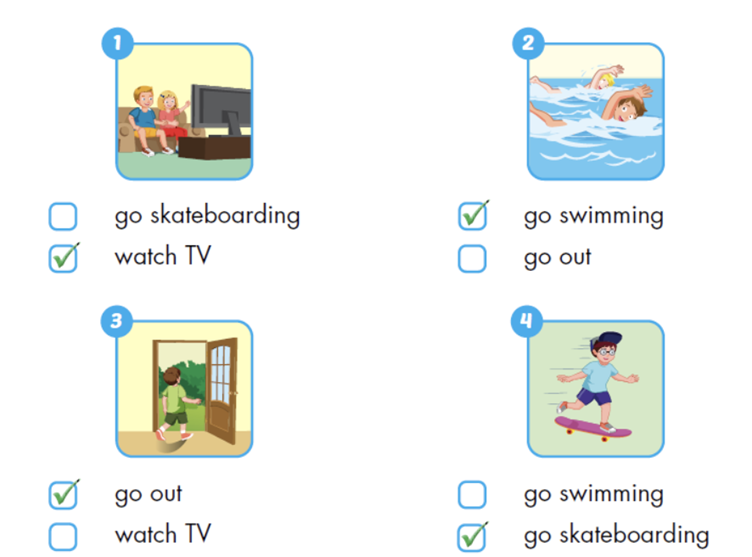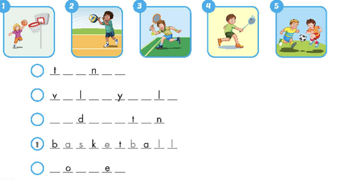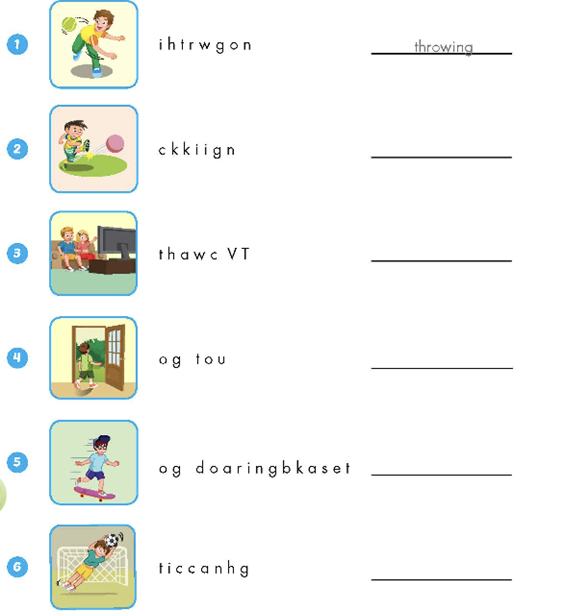 Circle the odd one out and write. Complete the words and match. Look and circle. What’s next? Look and write. Draw lines. Listen and put a tick or a cross. Complete the words. Read and fill in the blanks.